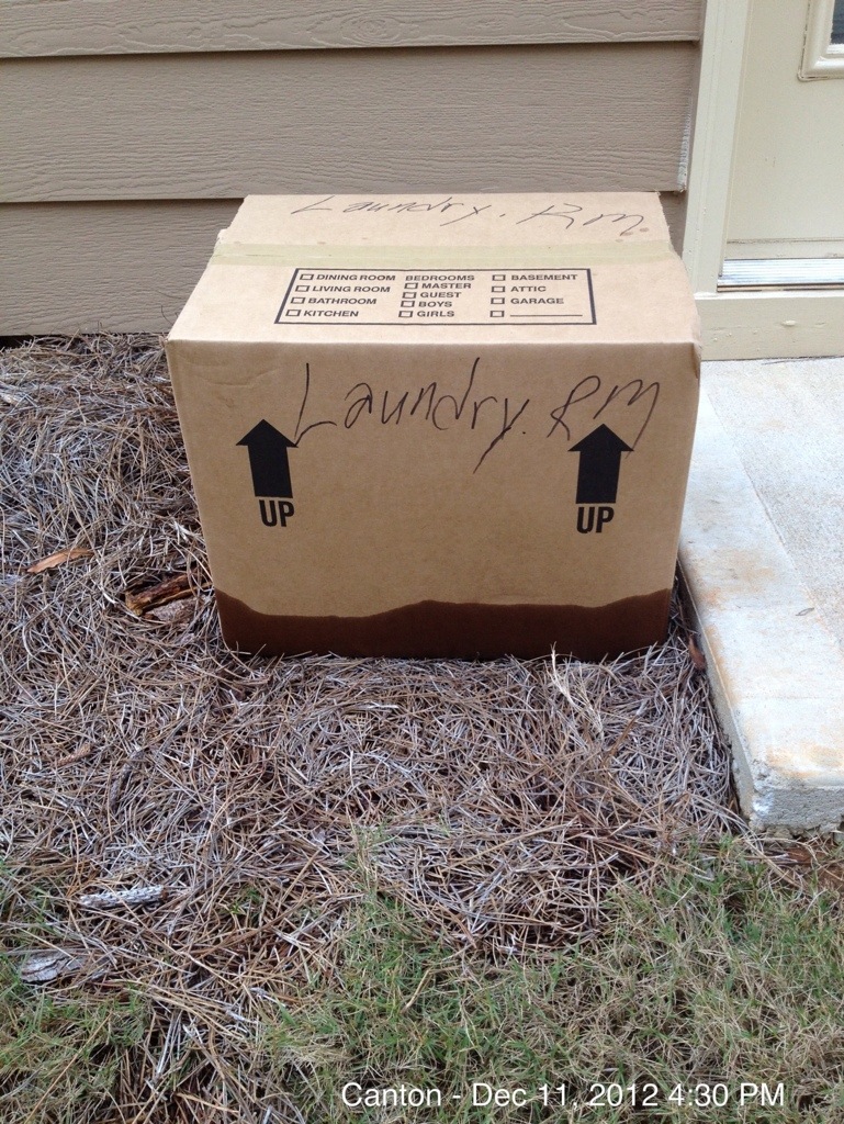The box was properly labeled. In this picture the box is MOST DEFINITELY NOT LABELED PROPERLY! “Laundry Room” does not tell you there are messy cleaning supplies inside!