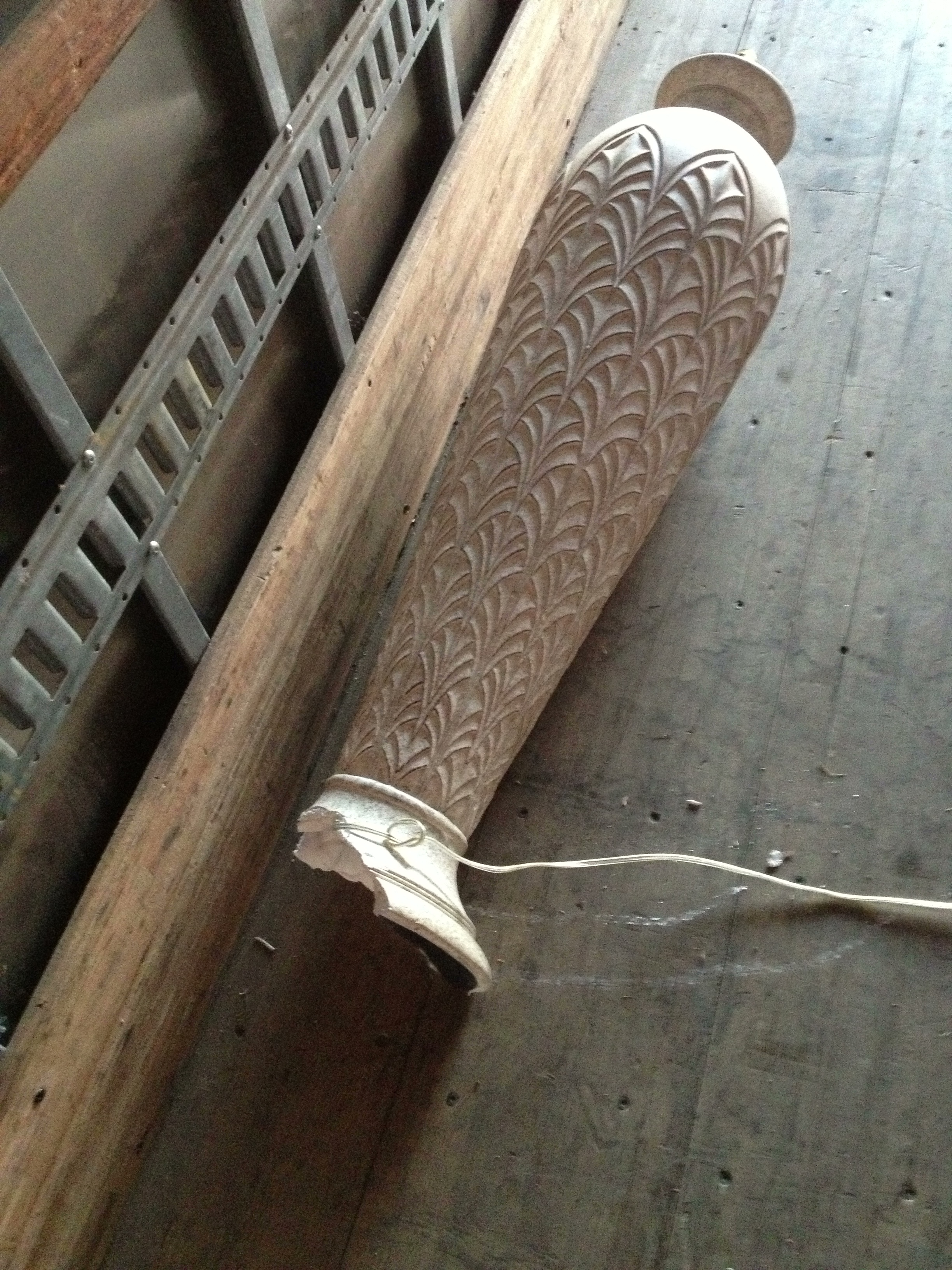 Galileo’s “Square-Cube Law” explains how as an object gets bigger, it tends to get weaker unless it becomes relatively significantly more dense.  A tall standing lamp like this one tends to be more fragile than if it was table-sized.  So if any item should get the tender treatment—it was this lamp—but instead they piled books on top of it.  And the damage seen in these pictures was the result!